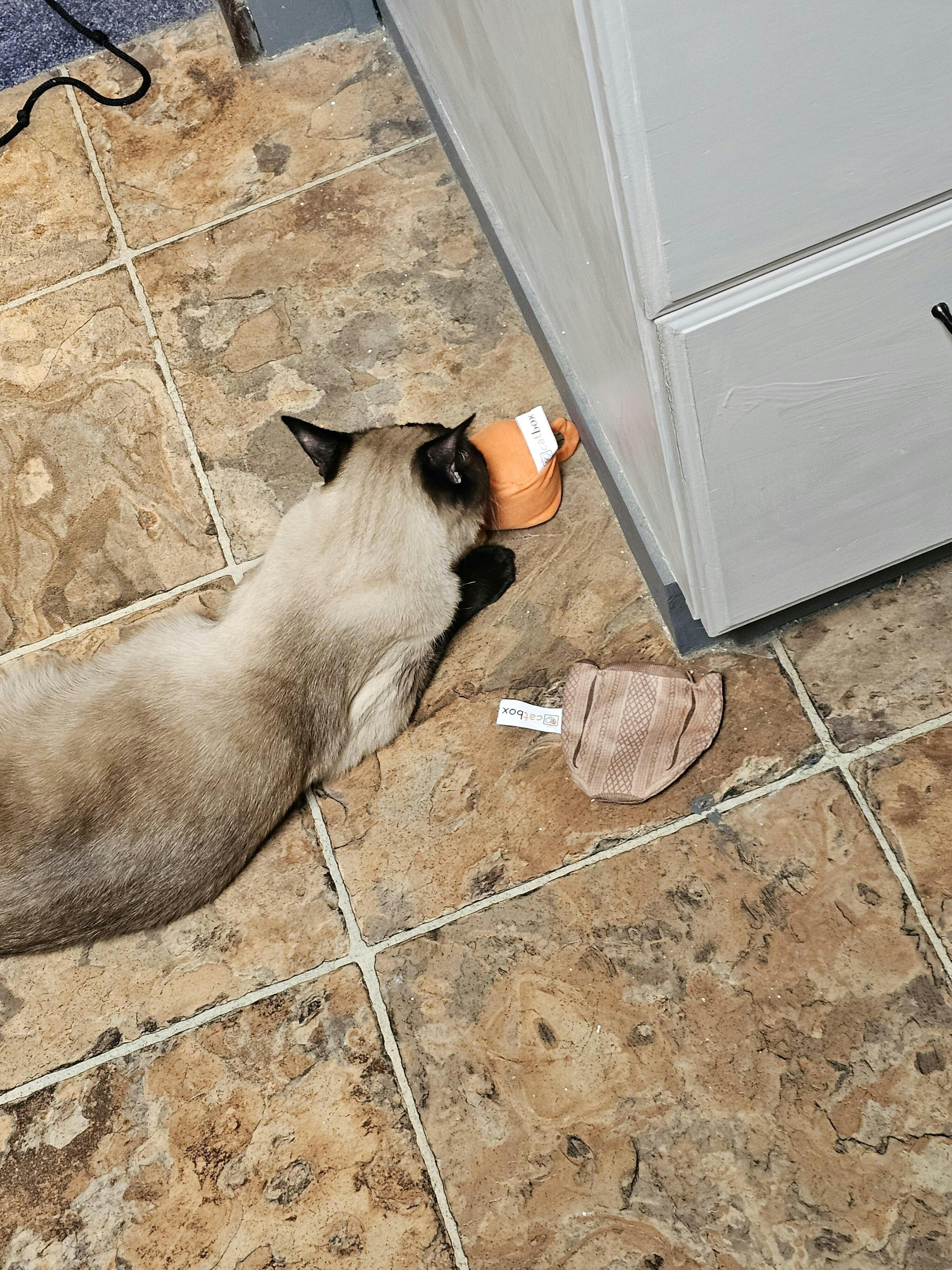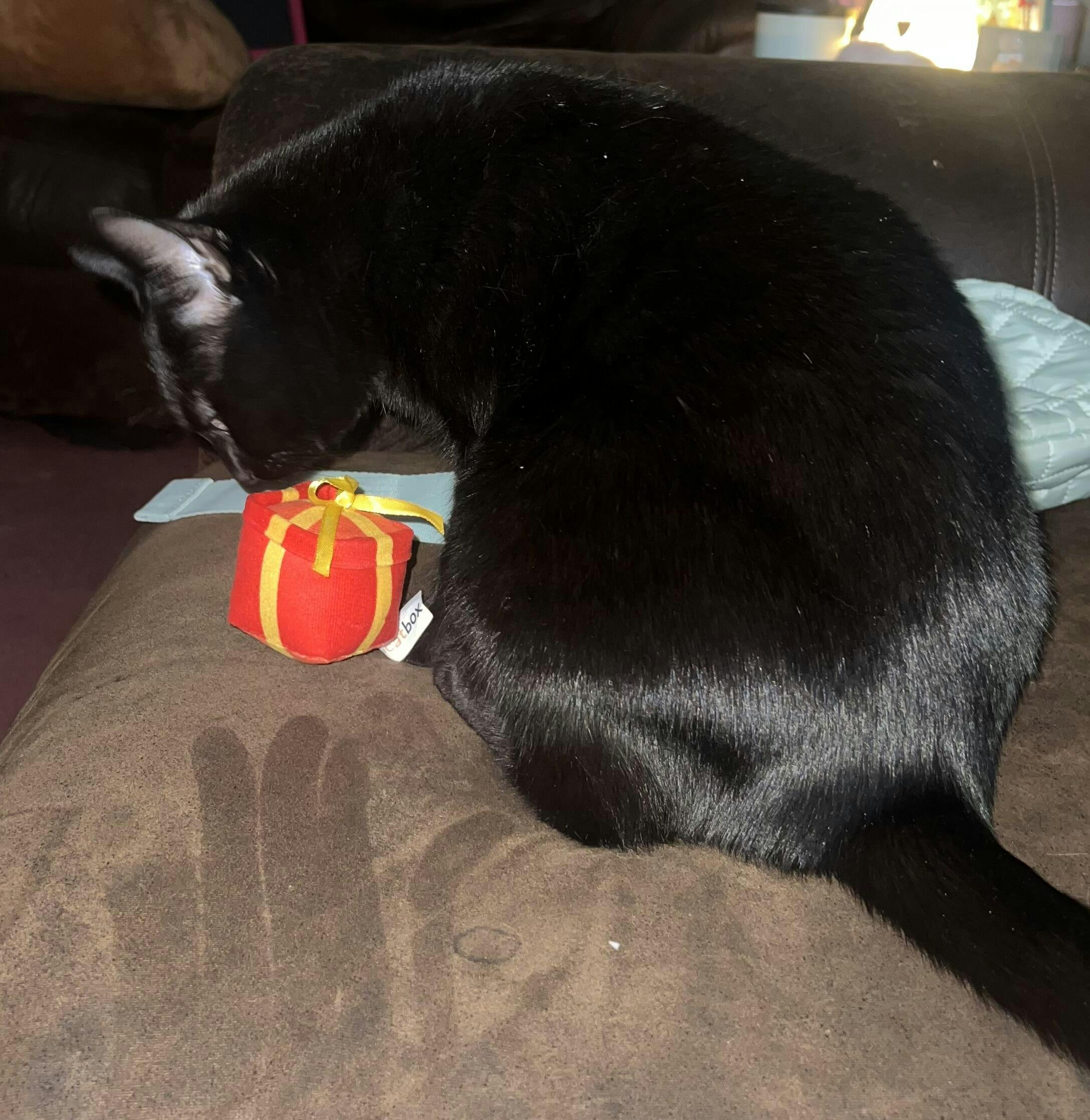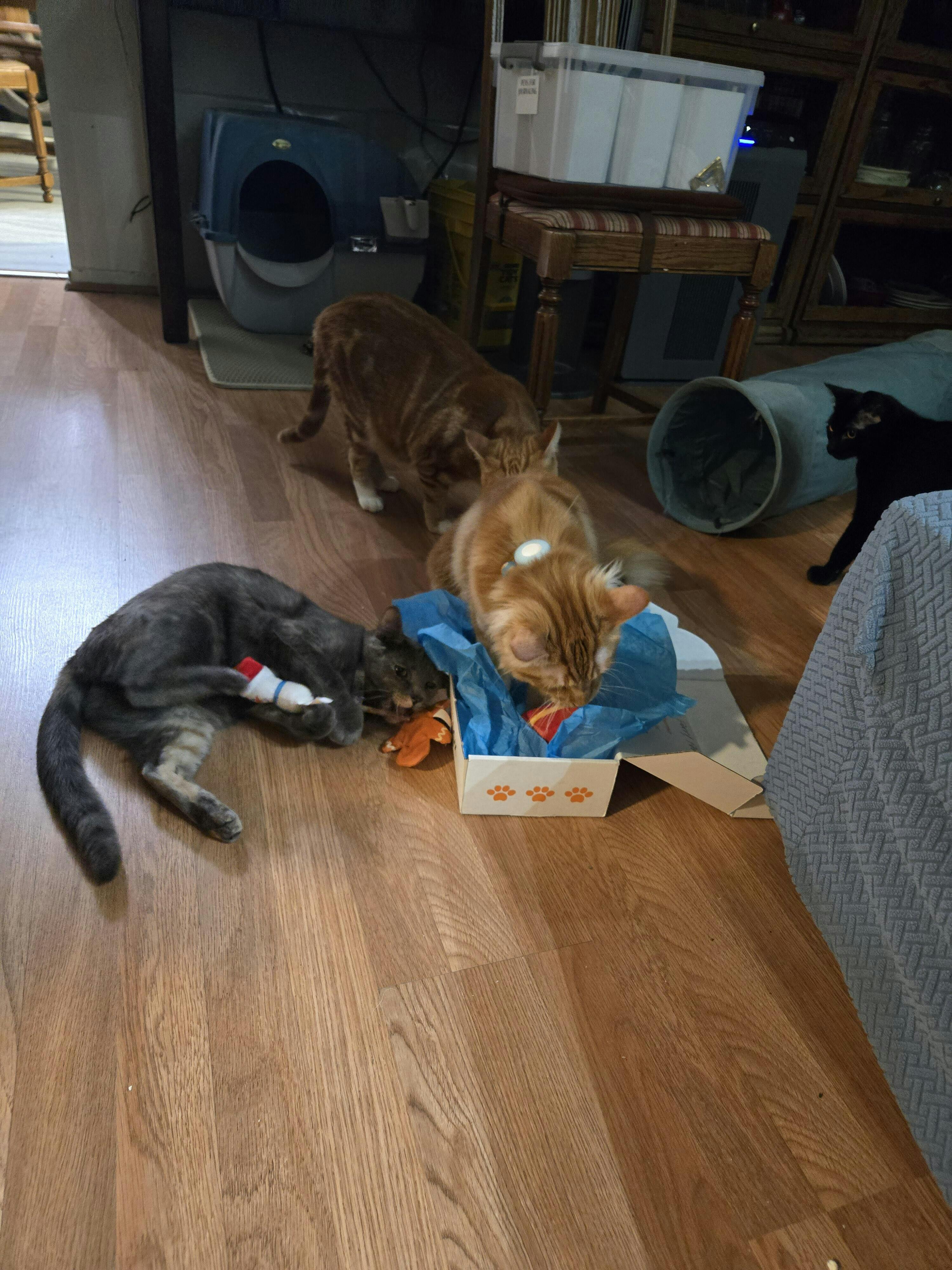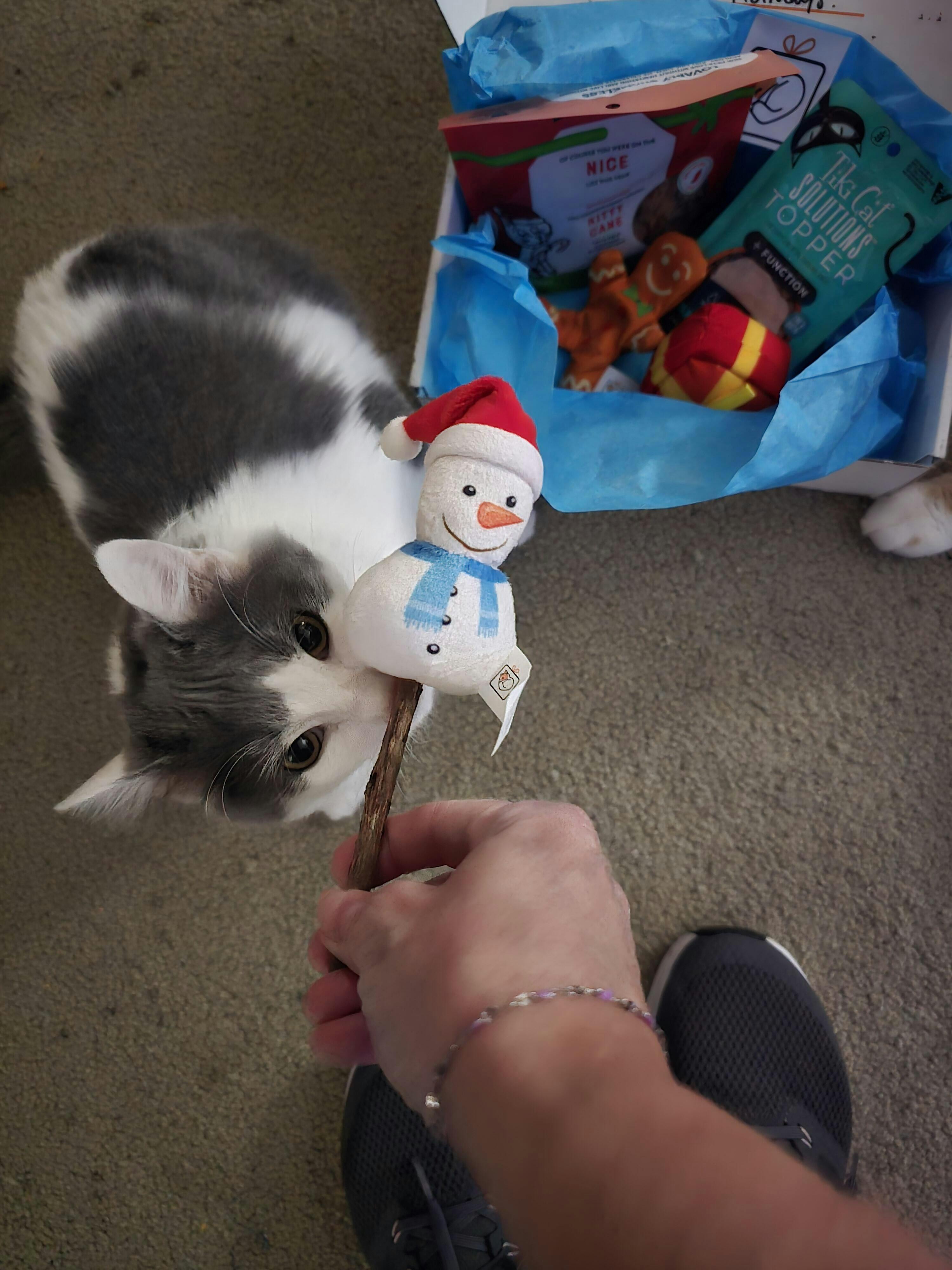Every box comes with 3 hand-made toys with a fun theme, along with 2 yummy treats. And of course, the box for your cat(s) to sit in!