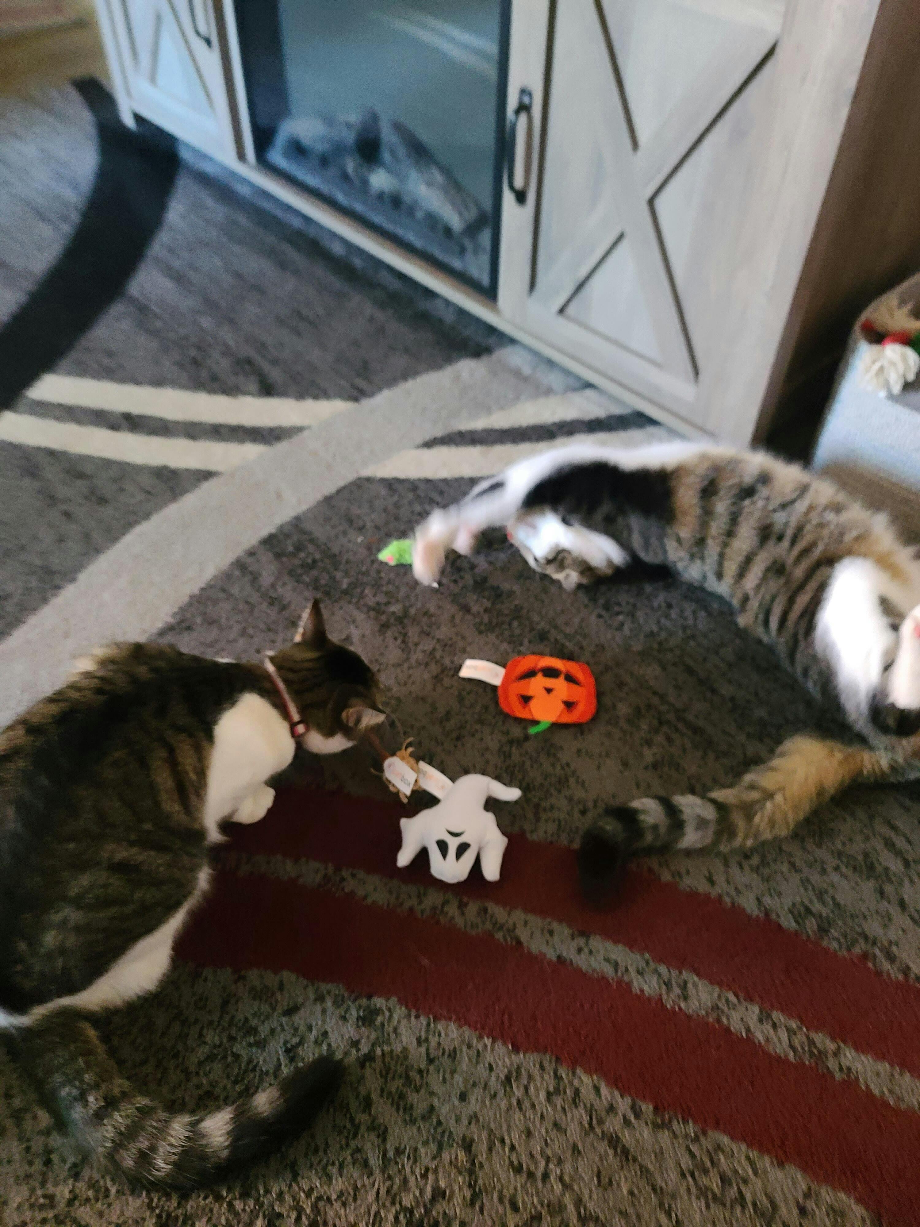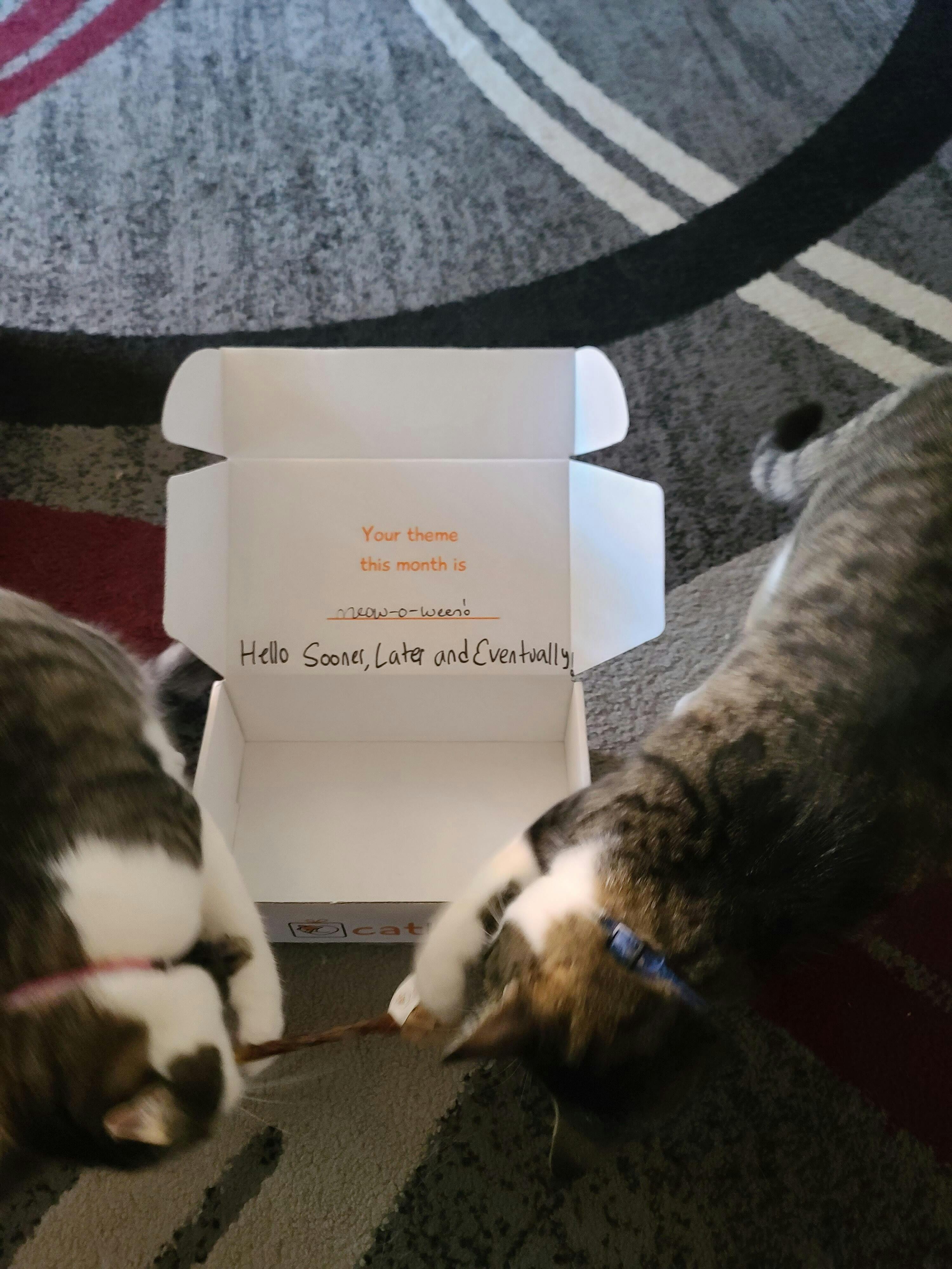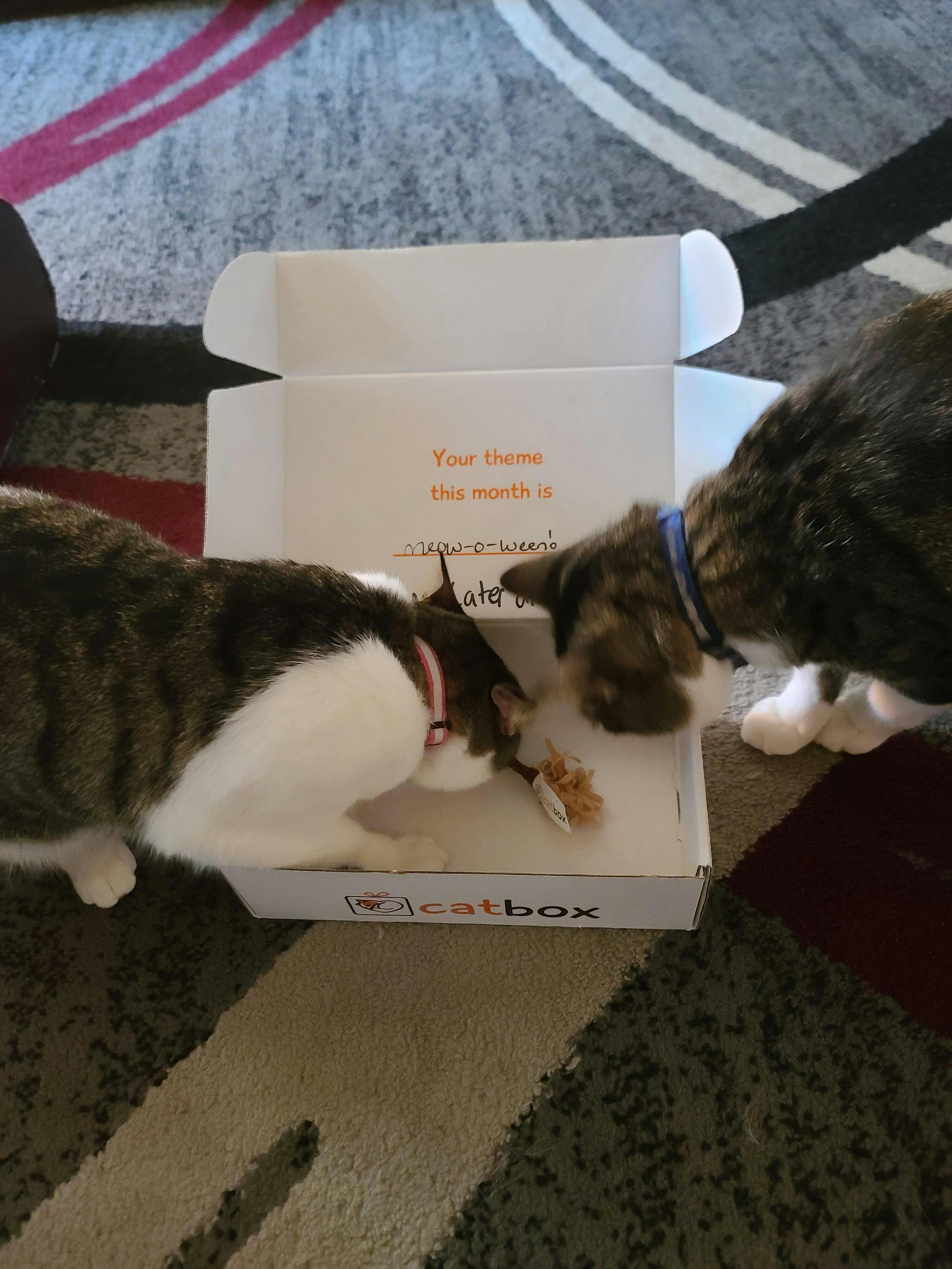 Every box comes with 3 hand-made toys with a fun theme, along with 2 yummy treats. And of course, the box for your cat(s) to sit in!